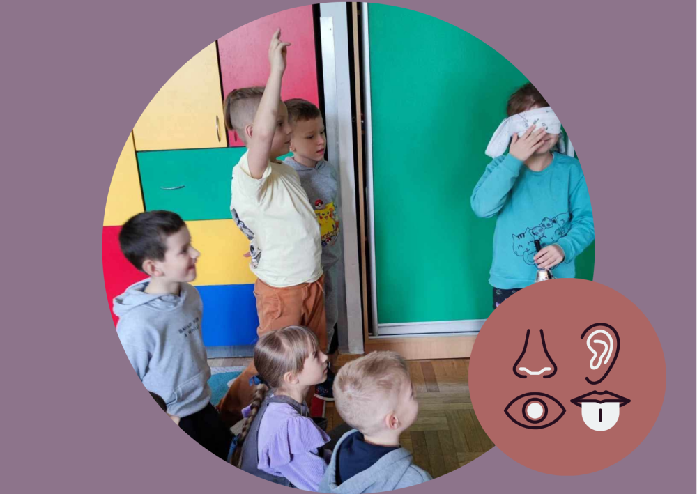 Nie zabrakło również zabaw tematycznych, które pozwoliły dzieciom jeszcze lepiej zrozumieć rolę zmysłów w codziennym życiu. Jedną z najbardziej ekscytujących aktywności była zabawa, w której każde dziecko z zamkniętymi oczami losowało przedmiot z tajemniczego worka. Korzystając wyłącznie ze zmysłu dotyku, musiało odgadnąć, co trzyma w rękach.