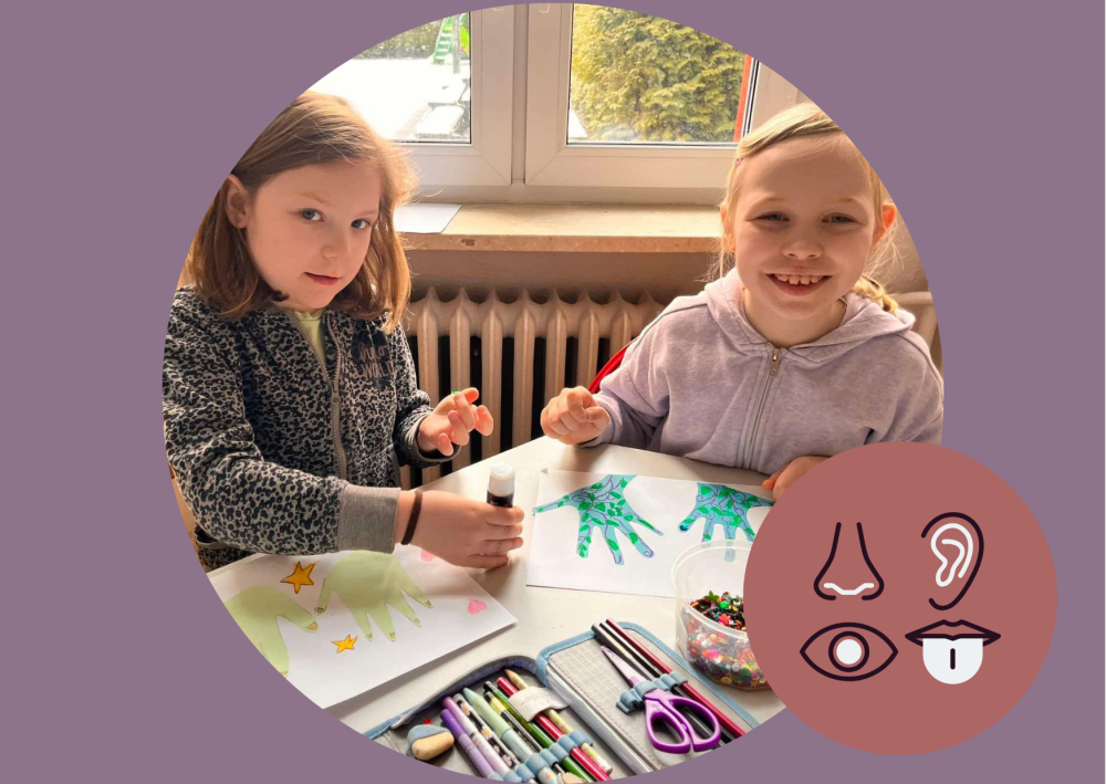 Na zakończenie zajęć, dzieci przystąpiły do twórczej pracy plastycznej. Każde dziecko odcisnęło własną dłoń na kartce papieru, tworząc wyjątkowe i kolorowe prace. Odbicia dłoni zostały ozdobione rysunkami i symbolami, które nawiązywały do zmysłów – np. oko dla wzroku, ucho dla słuchu czy nos dla węchu. To była świetna okazja do rozwijania kreatywności i rozmów o tym, jak dłonie również są dla nas ważnym narzędziem poznawczym.