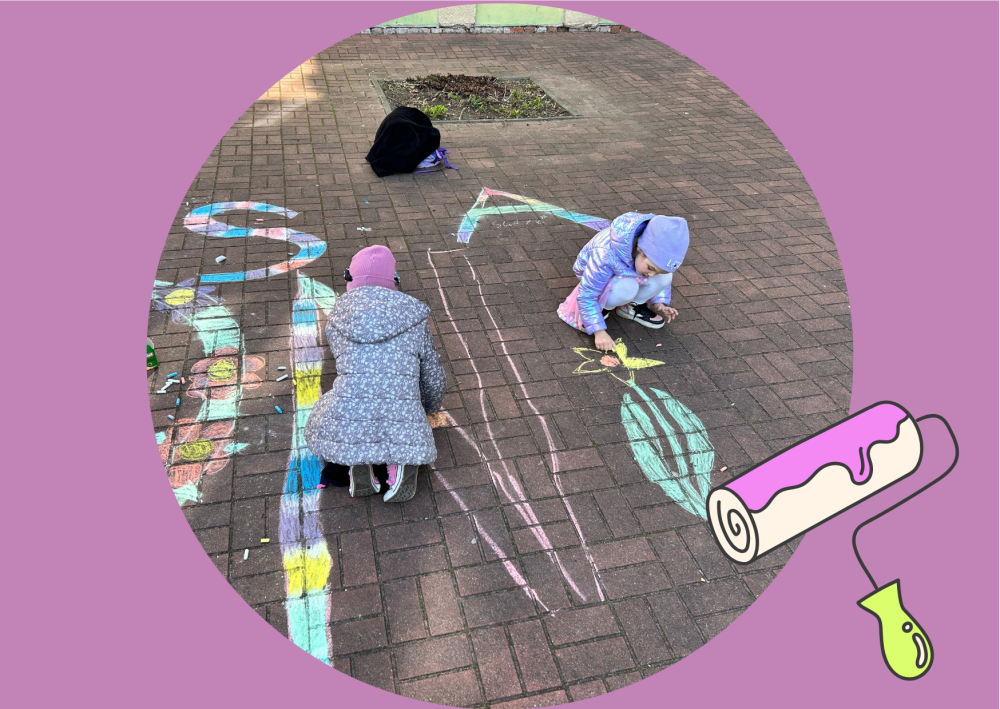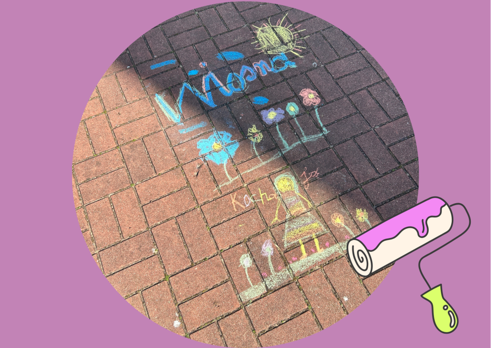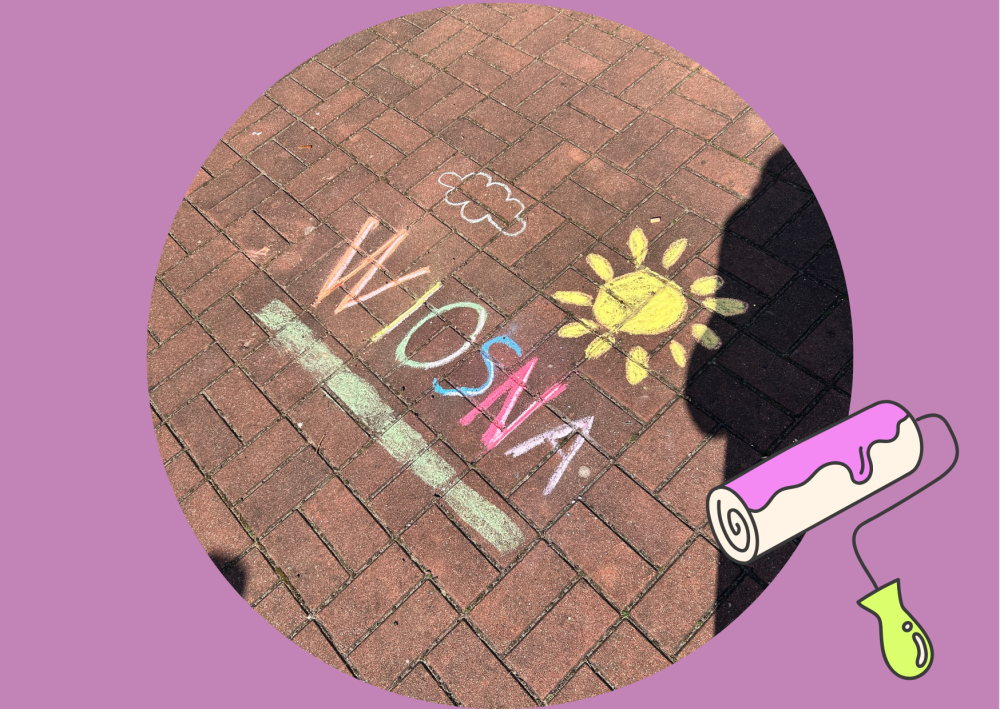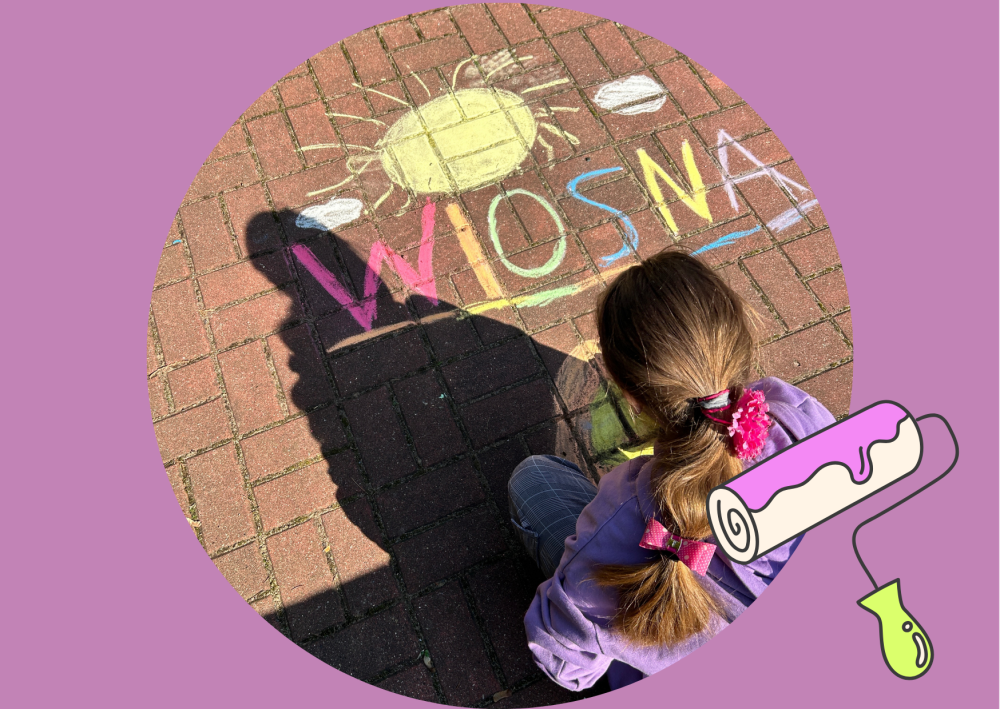Dzieci z zaangażowaniem i ogromną radością stworzyły kolorowe, wiosenne kompozycje, wykorzystując kredę jako główne narzędzie swojej ekspresji. Hasło „Wiosna” stało się dla nich pretekstem do rozwinięcia wyobraźni i wspólnego działania. W rezultacie nasze szkolne patio zamieniło się w galerię pełną barw, radości i dziecięcej energii.