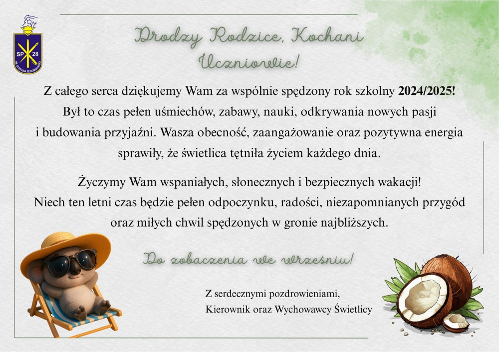 Życzymy Wam słonecznych, bezpiecznych i i niezapomnianych wakacji - pełnych odpoczynku, przygód i pięknych chwil w gronie najbliższych!