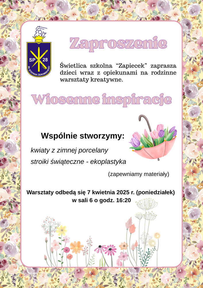 Świetlica szkolna „Zapiecek” przy Szkole Podstawowej nr 28 im. Stefana Żeromskiego serdecznie zaprasza uczniów wraz z opiekunami na rodzinne warsztaty kreatywne pod hasłem „Wiosenne inspiracje”.