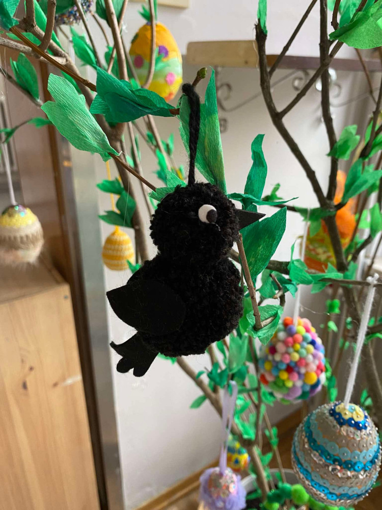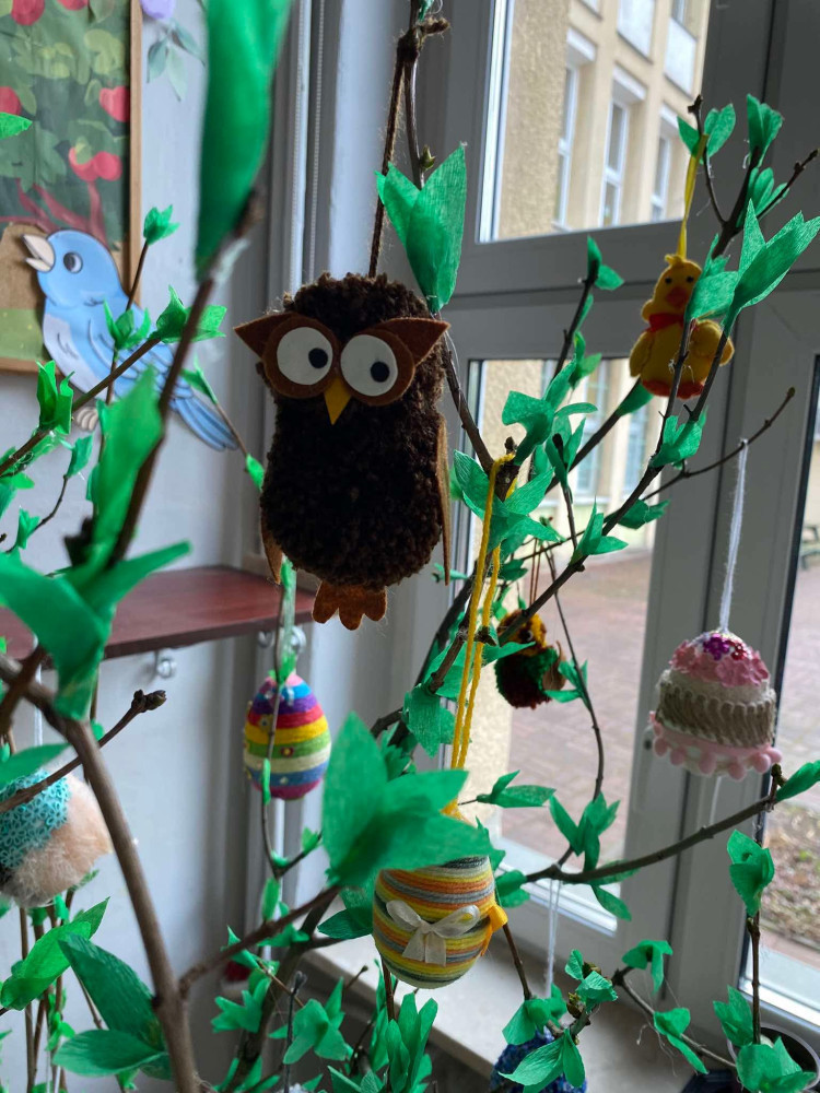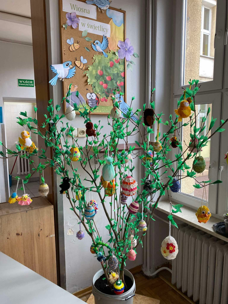 Na gałązkach zawisły różnorodne, tematyczne ozdoby przygotowane przez dzieci – kolorowe kurczaczki, zajączki, sowy oraz pisanki. Dzięki temu drzewko nabrało nie tylko wielkanocnego, ale także ogólnie wiosennego charakteru, pełnego barw i radosnych akcentów.