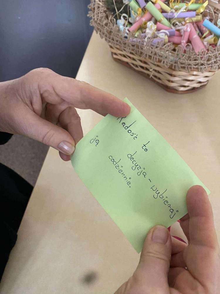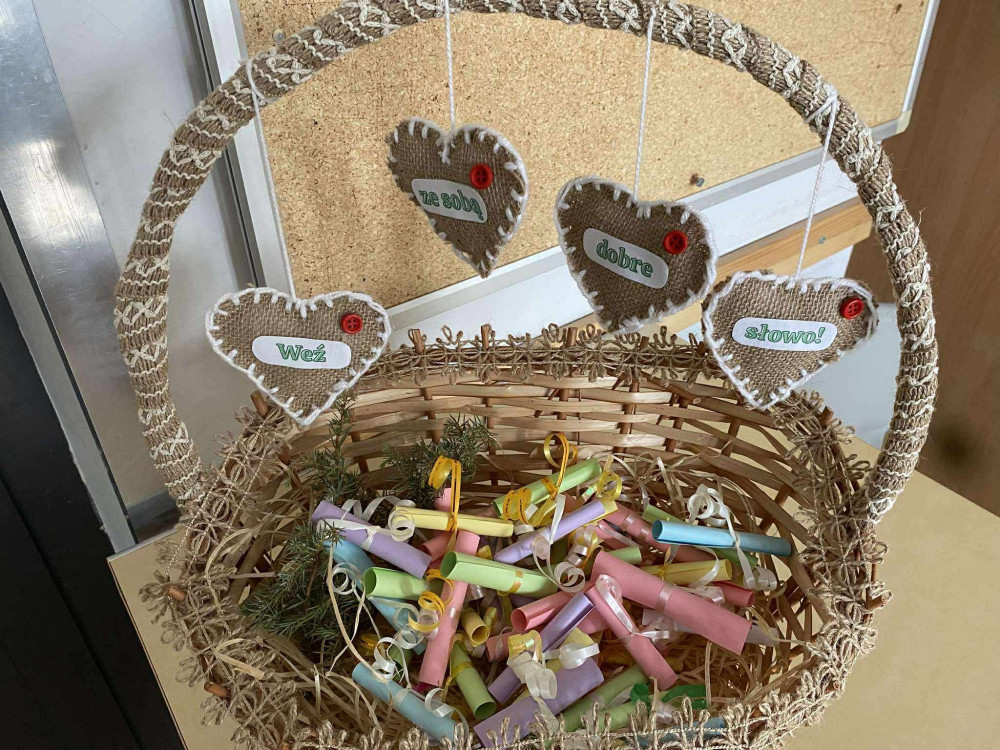 Jednym z głównych elementów obchodów był specjalnie przygotowany koszyczek pełen miłych słów i inspirujących myśli. Uczniowie oraz opiekunowie świetlicy rozdawali je wszystkim, których napotkali na szkolnych korytarzach i w salach. Każdy losowany bilecik był drobnym, lecz ważnym przypomnieniem, że życzliwe słowa potrafią poprawić humor, dodać odwagi i wzmocnić poczucie wspólnoty.