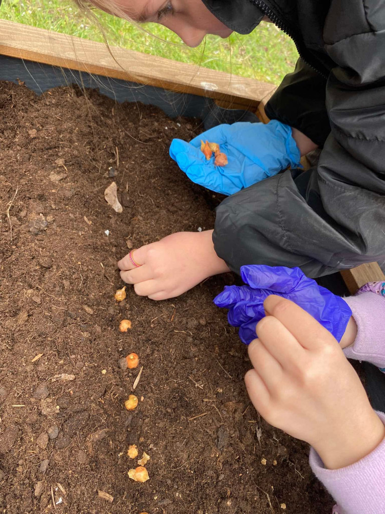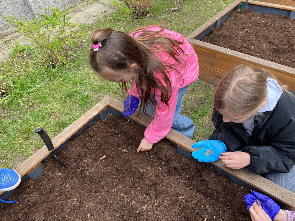 Kolejnym krokiem było przygotowanie gleby pod przyszłe uprawy oraz wysiew i sadzenie roślin. Dzieci z ogromnym entuzjazmem wysadzały nasionka marchewki, buraka i koperku, a także sadziły cebulę. Była to nie tylko doskonała okazja do poznania podstaw ogrodnictwa, ale również do rozwijania cierpliwości i systematyczności – wartości niezbędnych w procesie wzrostu roślin.