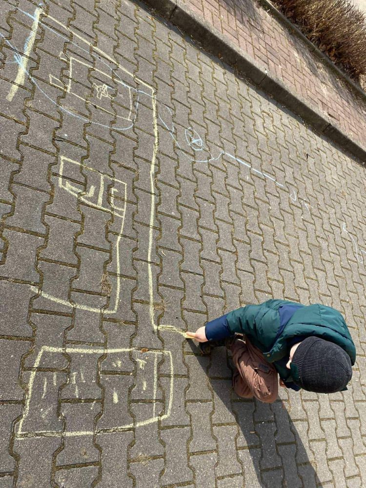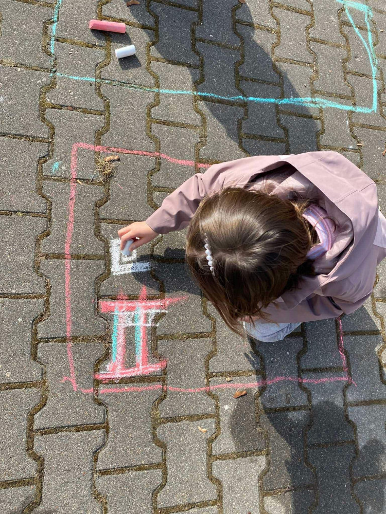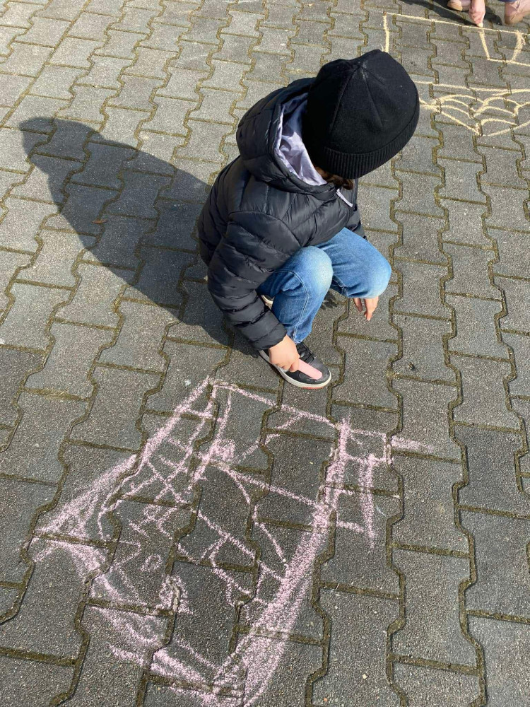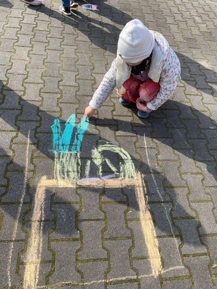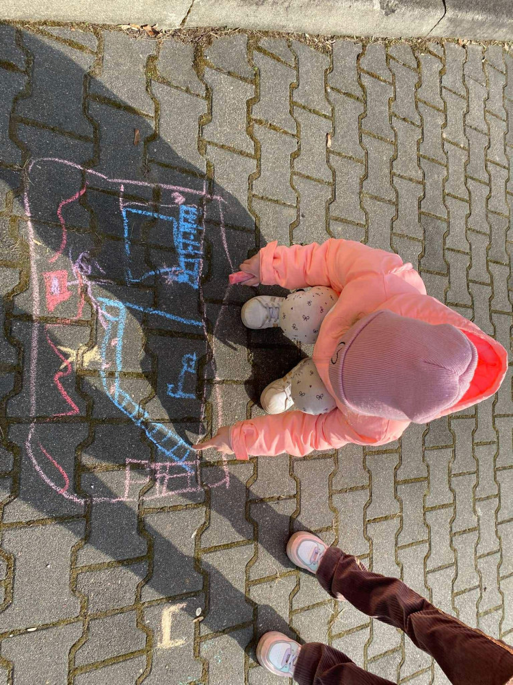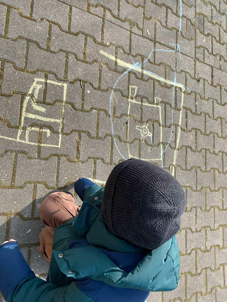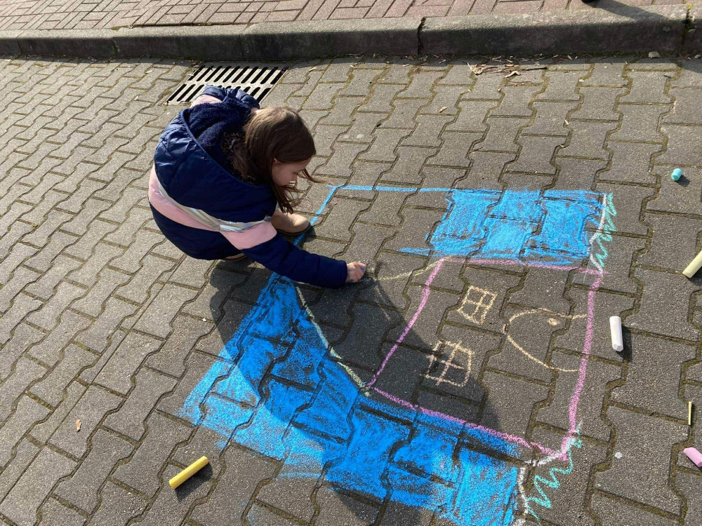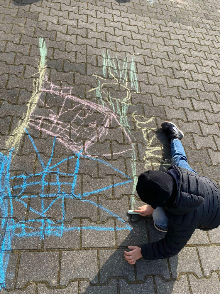 W części plastycznej zajęć dzieci przeniosły swoje pomysły na patio szkolne, gdzie rysowały kredą ilustracje przedstawiające ich ulubione miejsca w domu. Powstały kolorowe i pomysłowe prace ukazujące pokoje, kąciki zabaw oraz chwile spędzane z rodziną.