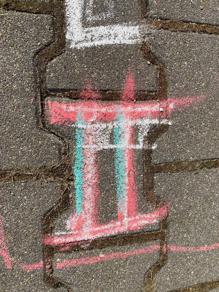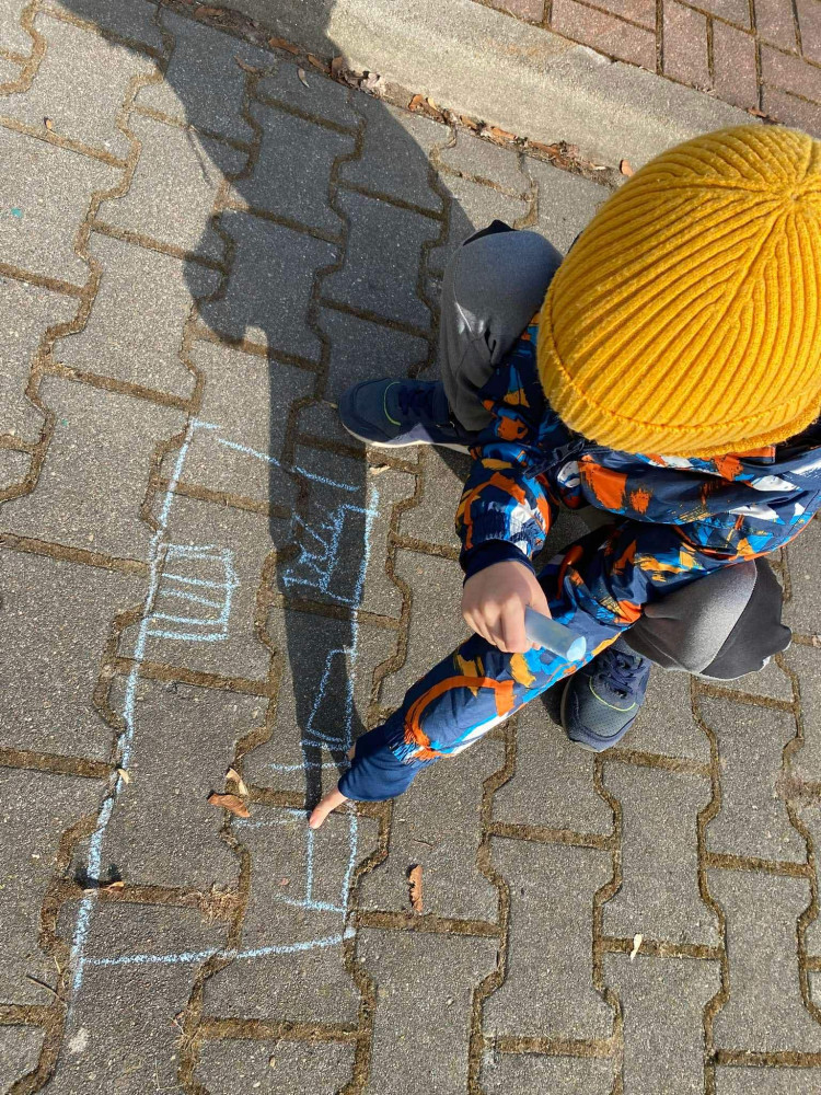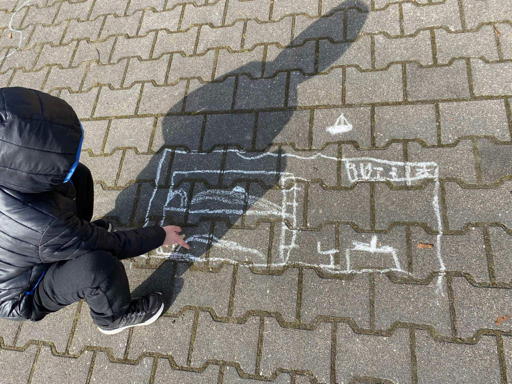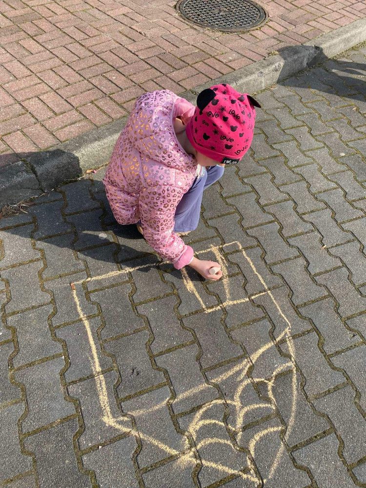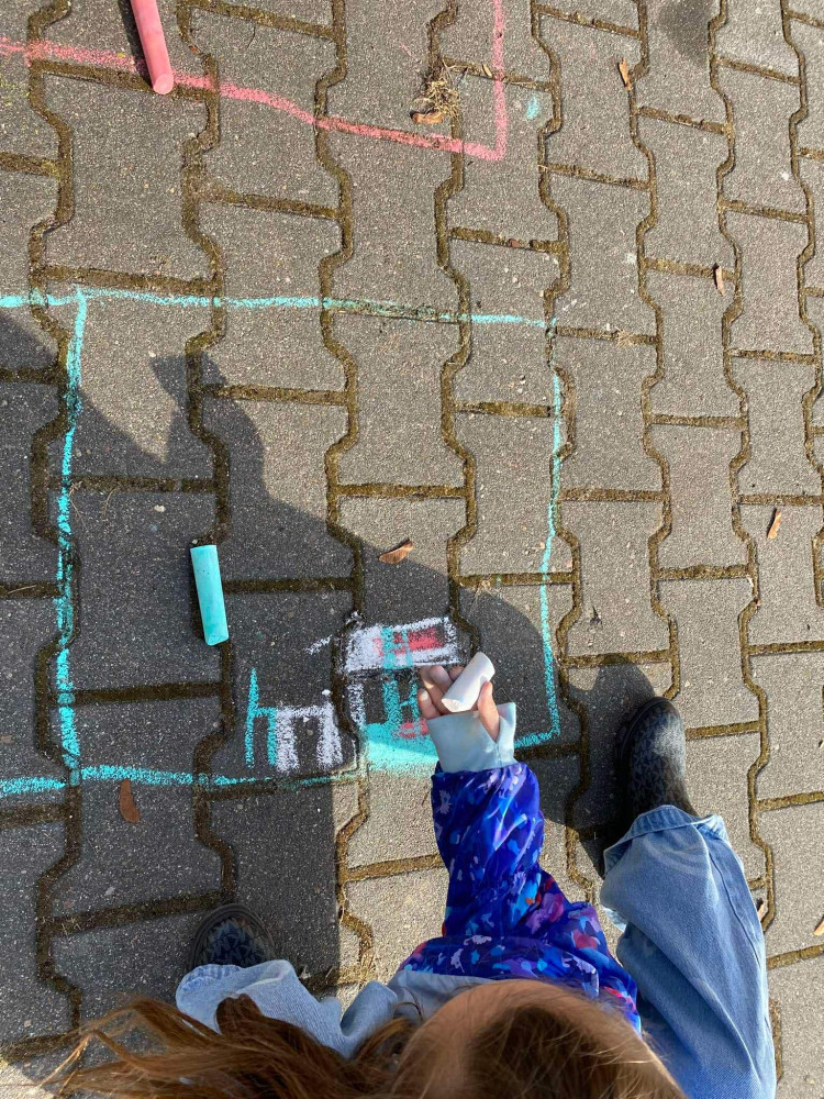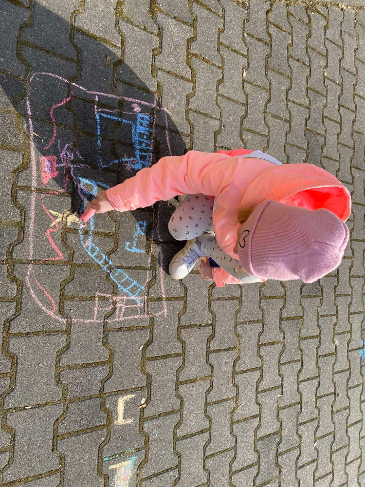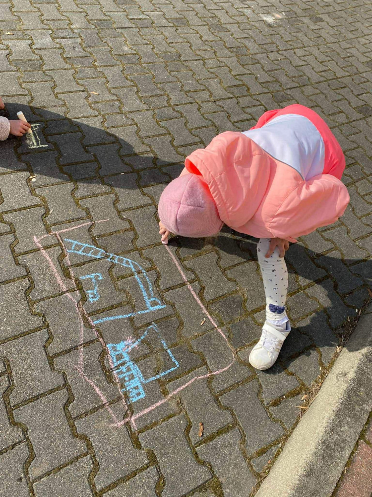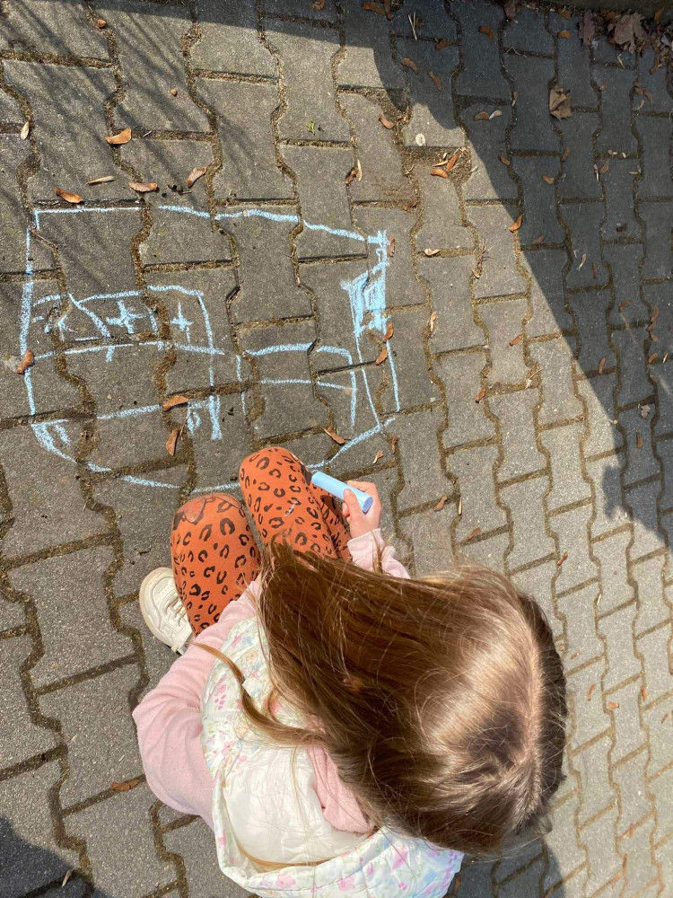 W części plastycznej zajęć dzieci przeniosły swoje pomysły na patio szkolne, gdzie rysowały kredą ilustracje przedstawiające ich ulubione miejsca w domu. Powstały kolorowe i pomysłowe prace ukazujące pokoje, kąciki zabaw oraz chwile spędzane z rodziną.