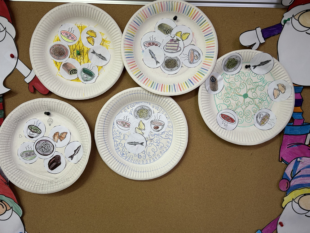 W części plastycznej uczniowie wykonali prace przedstawiające talerze z potrawami wigilijnymi, które nawiązywały do rodzinnych tradycji kulinarnych omawianych podczas zajęć.