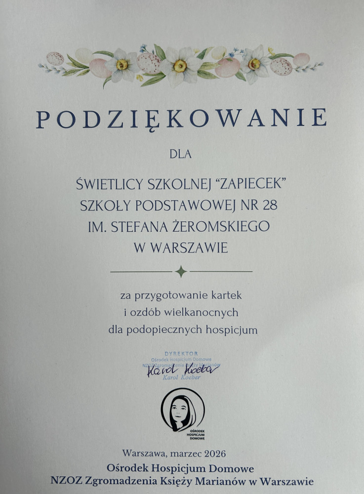 Z radością informujemy, że nasza świetlica otrzymała wyjątkowe podziękowania od Ośrodka Hospicjum Domowego Zgromadzenia Księży Marianów w Warszawie.