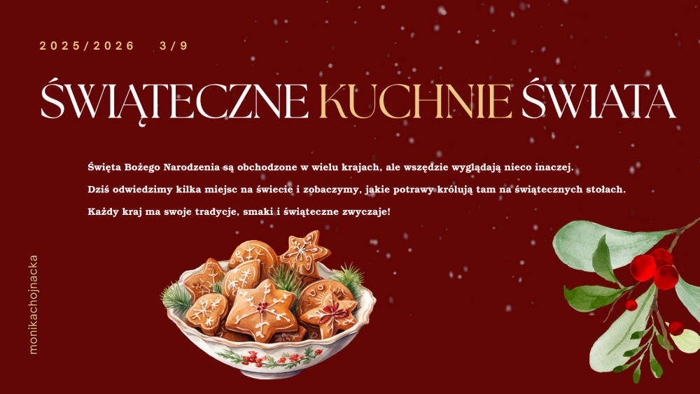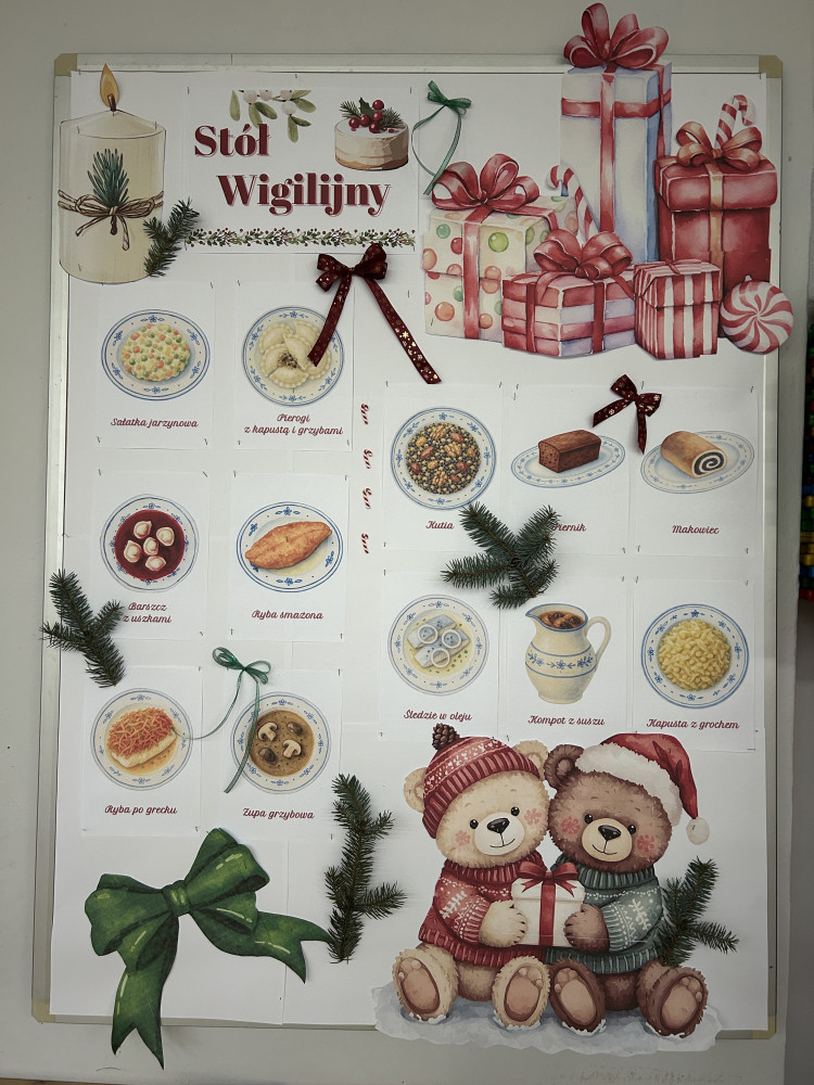 Podczas zajęć rozmawialiśmy o tym, jak obchodzi się Święta Bożego Narodzenia w różnych krajach i czym różnią się one od polskich tradycji, poznawaliśmy świąteczne potrawy charakterystyczne dla Polski, Niemiec, Włoch oraz Stanów Zjednoczonych, omówiliśmy znaczenie Wigilii w Polsce oraz tradycję 12 potraw wigilijnych, dowiedzieliśmy się, jakie potrawy pojawiają się na świątecznych stołach w innych krajach (m.in. pierniki i pieczona gęś w Niemczech, panettone we Włoszech czy bożonarodzeniowy indyk w USA), a także przypomnieliśmy sobie zasady Zero Waste i rozmawialiśmy o tym, jak nie marnować jedzenia w czasie świąt oraz jak wykorzystywać resztki potraw i naturalne dekoracje.