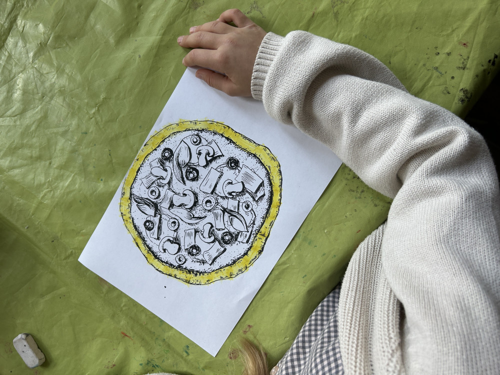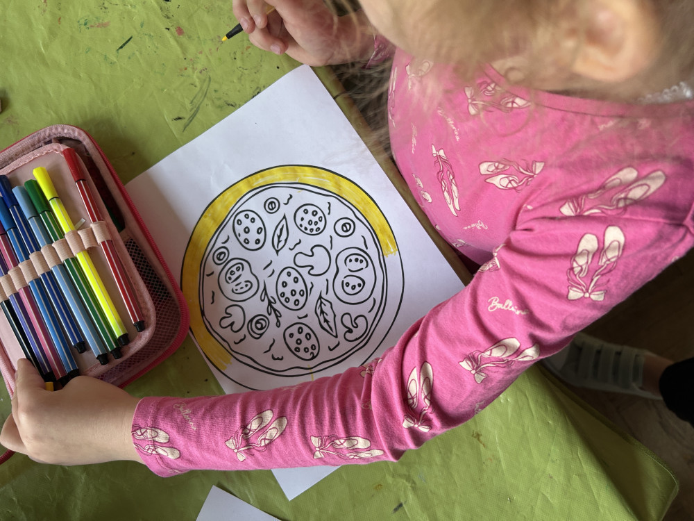 W części plastycznej wykonaliśmy wspólnie kolorowe pizze, które stworzyły piękną dekorację naszej świetlicy – pizzerię „Bambini”.