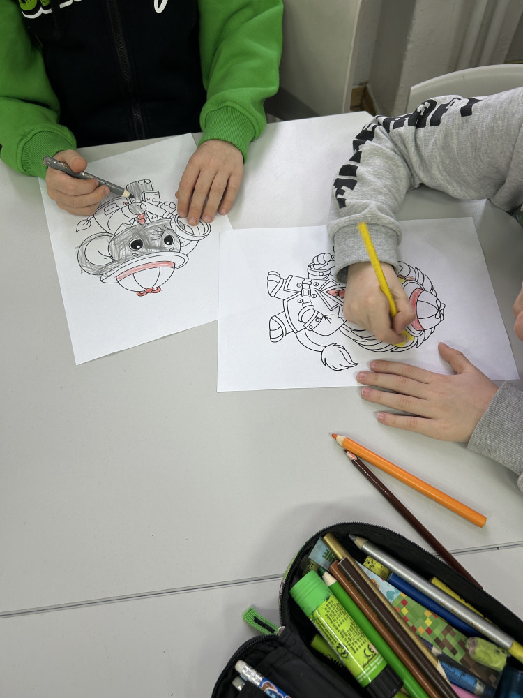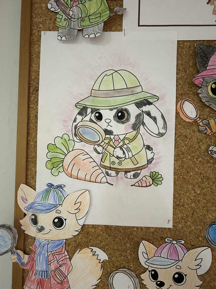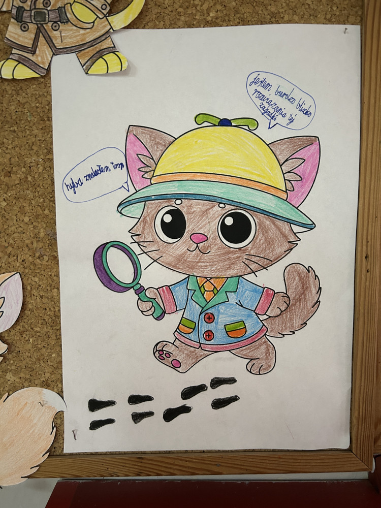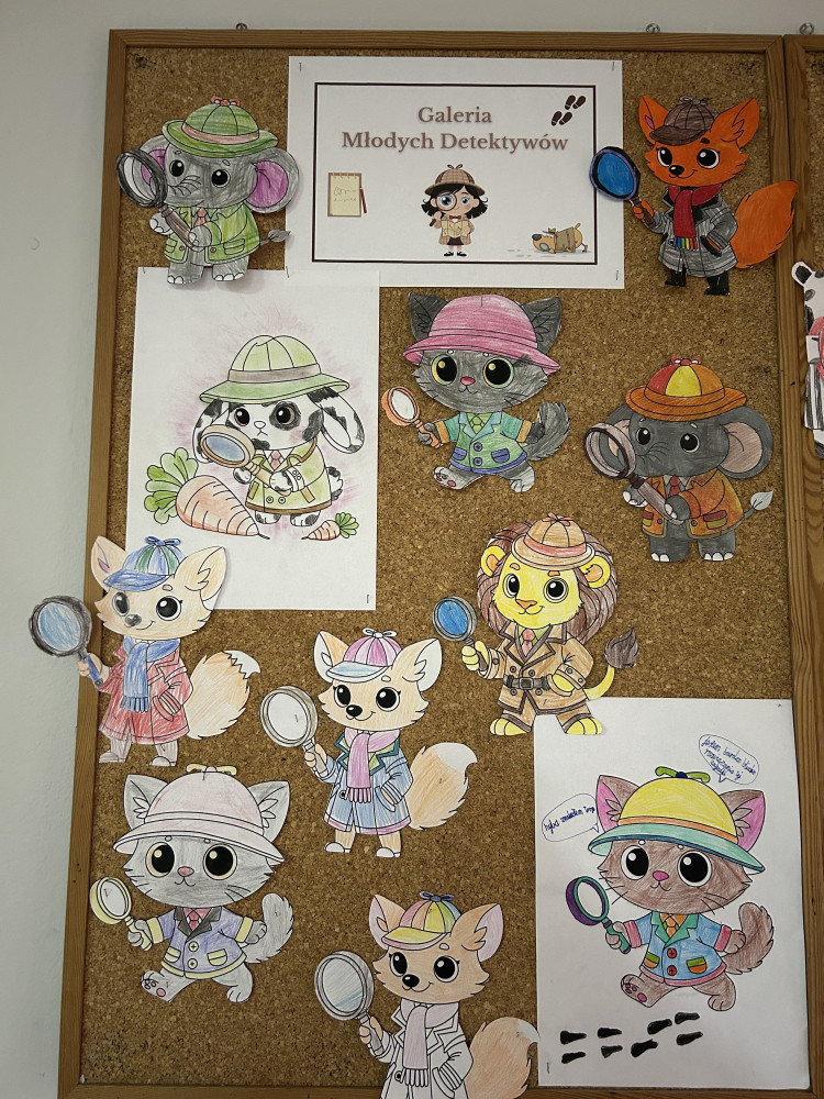 Zwieńczeniem zajęć była praca plastyczna, podczas której uczniowie stworzyli własnych zwierzęcych detektywów – króliczki, liski, słoniki czy kotki, które symbolizują uważnych obserwatorów gotowych do odkrywania nowych informacji. Powstałe prace stały się ozdobą świetlicy, tworząc kolorową „Galerię Młodych Detektywów”.