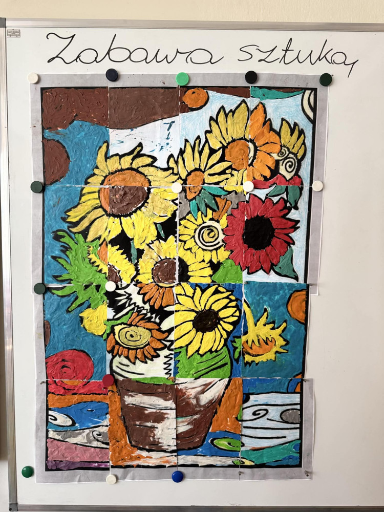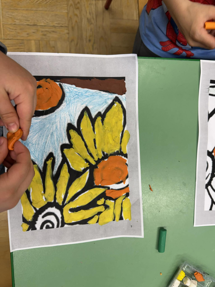 Dzieci pracowały nad wielkoformatową kolorowanką przedstawiającą słoneczniki – jeden z najbardziej rozpoznawalnych motywów w sztuce tego artysty. Każdy uczestnik wyklejał wybrane elementy pracy plasteliną, rozwijając przy tym swoją wyobraźnię, zdolności manualne oraz poczucie estetyki.