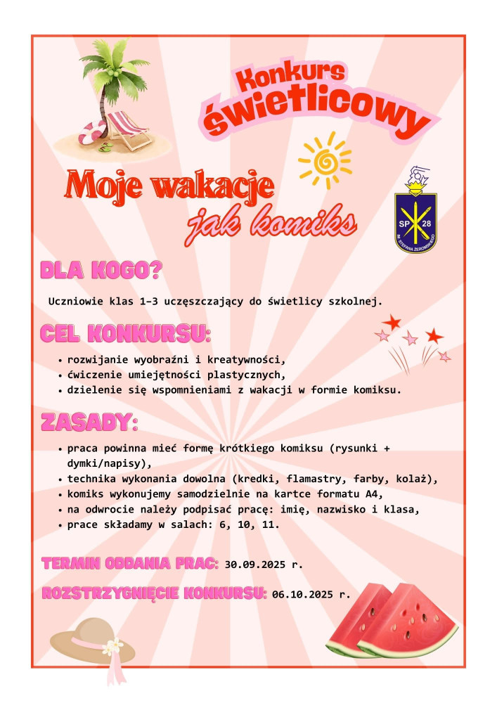 Świetlica szkolna zaprasza uczniów klas 1-3 do udziału w konkursie plastycznym "Moje wakacje jak komiks".