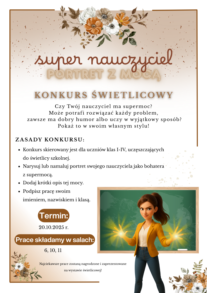 Zapraszamy wszystkich uczniów klas I-IV uczęszczających do świetlicy do udziału w konkursie plastycznym. Zadanie polega na stworzeniu portretu swojego nauczyciela lub nauczycielki – tym razem nie jako zwyczajnej osoby, ale jako bohatera obdarzonego niezwykłą mocą.