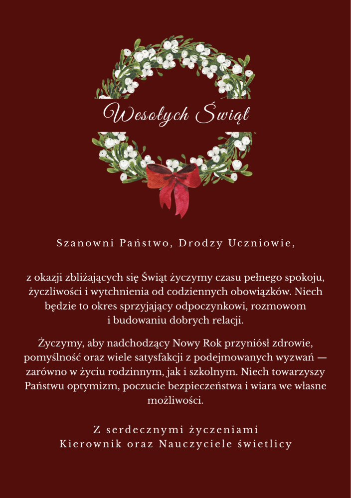 z okazji zbliżających się Świąt życzymy czasu pełnego spokoju, życzliwości i wytchnienia od codziennych obowiązków. Niech będzie to okres sprzyjający odpoczynkowi, rozmowom i budowaniu dobrych relacji.