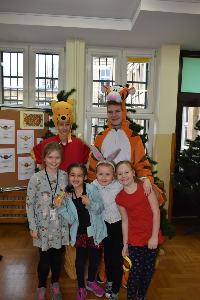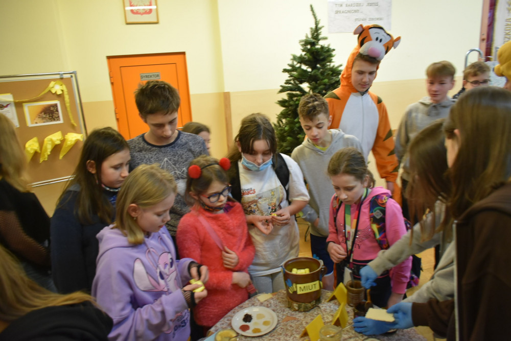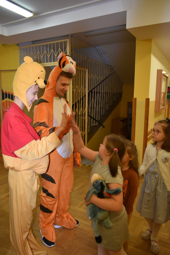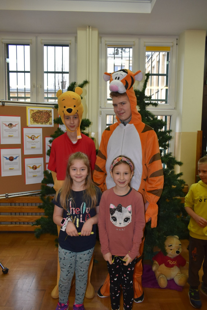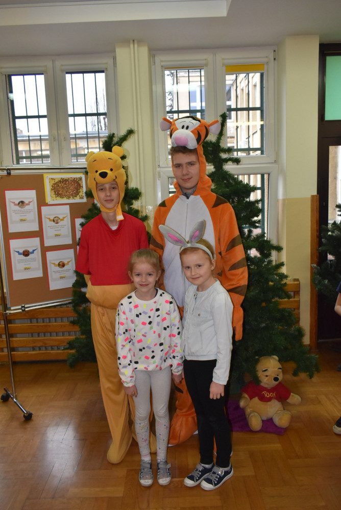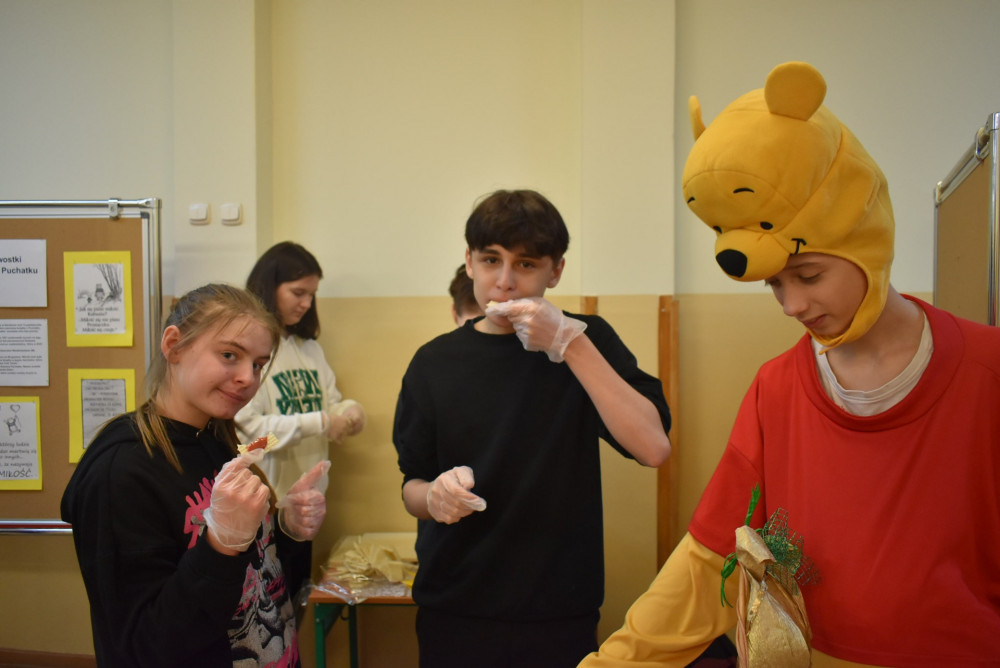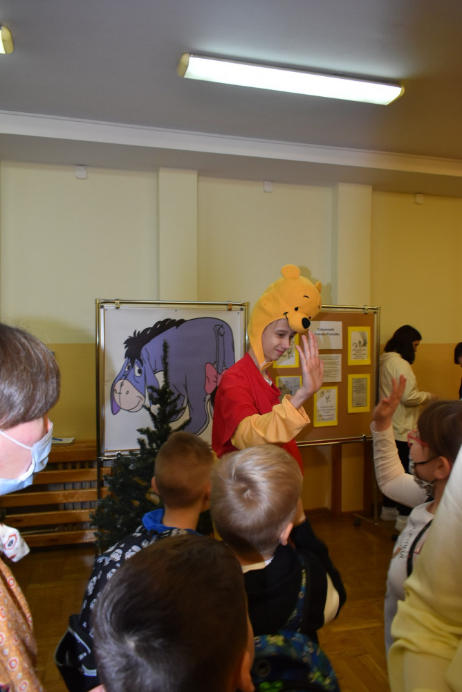 Wolontariusze klas starszych pod kierunkiem pani pedagog stworzyli w dniu 19 stycznia 2022 roku niezapomniane święto Kubusia Puchatka i jego przyjaciół. Dwóch uczniów przebrało się w stroje Puchatka i Tygryska i pozowali do zdjęć z młodszymi uczniami. Tego dnia miała również miejsce degustacja miodów. Można było schować się w Stumilowym Lesie i przytulić maskotki.