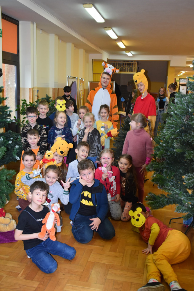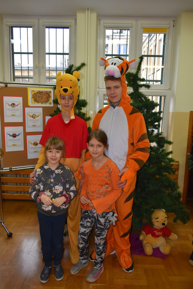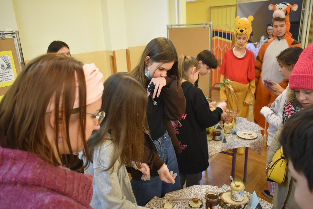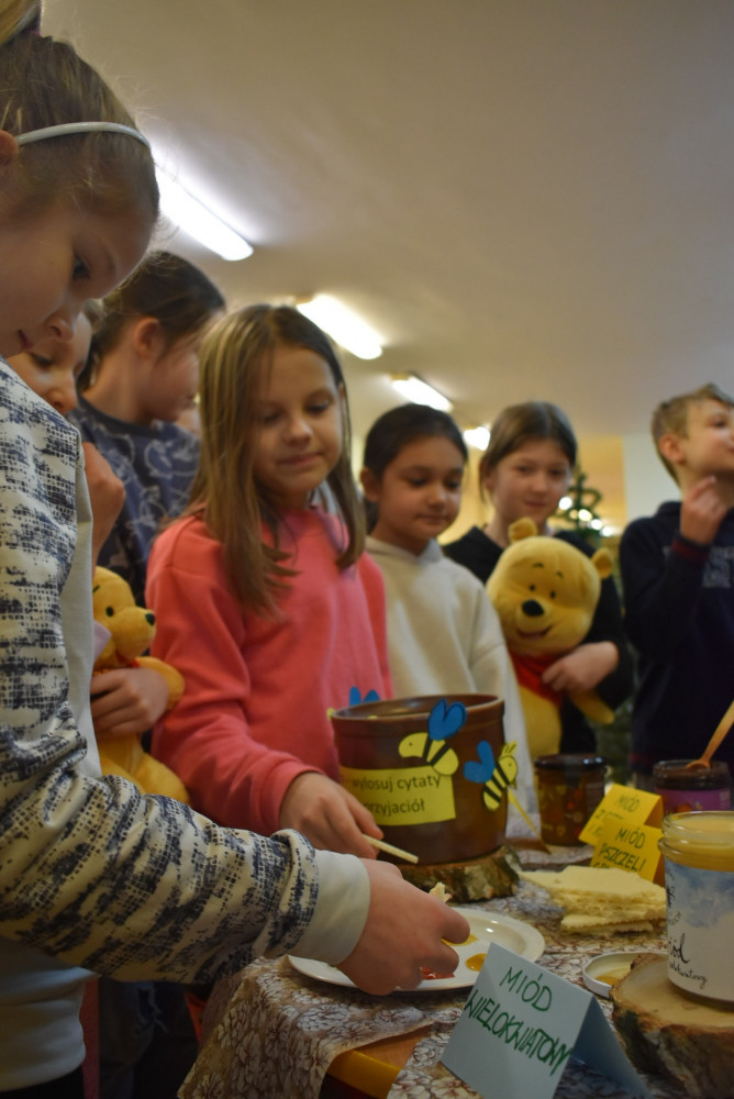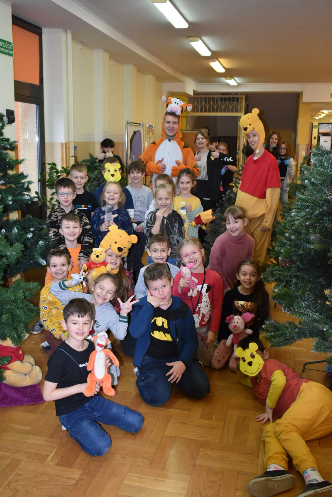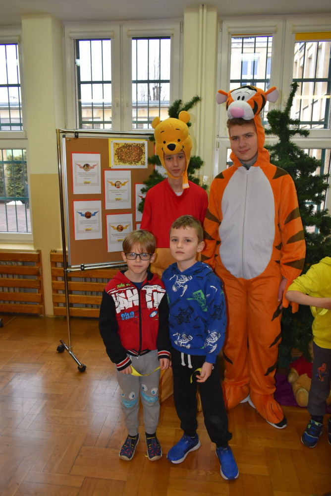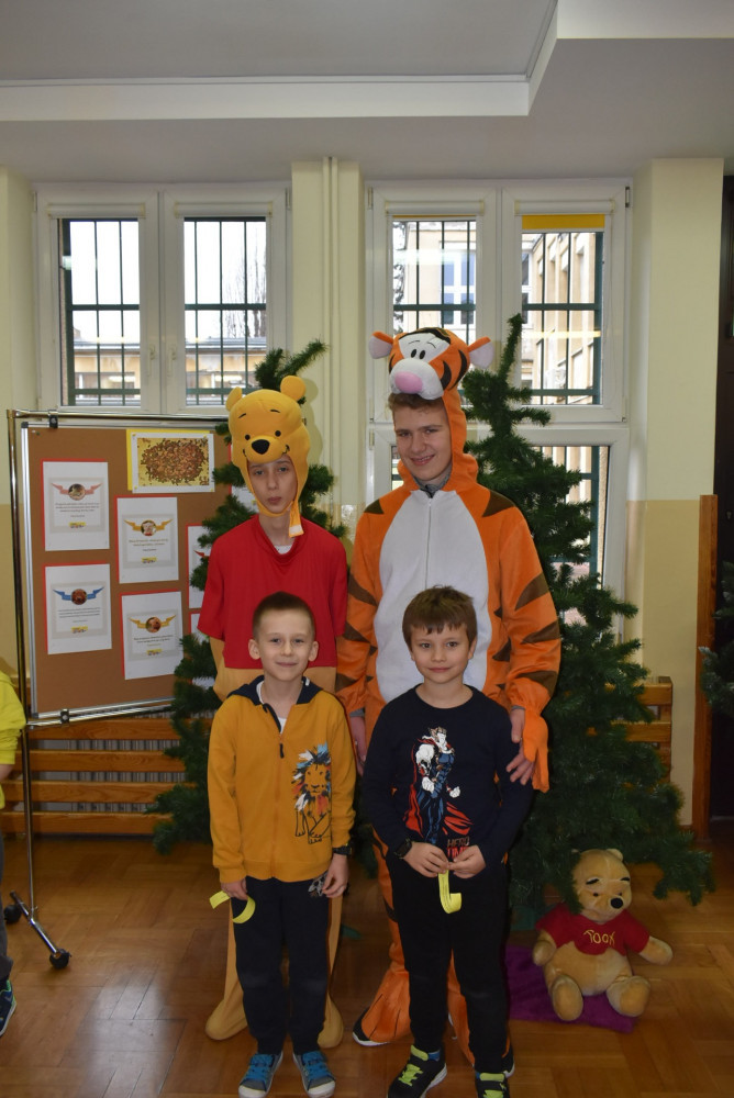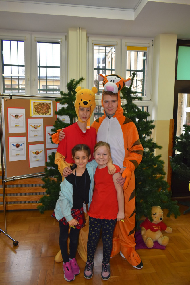 Wolontariusze klas starszych pod kierunkiem pani pedagog stworzyli w dniu 19 stycznia 2022 roku niezapomniane święto Kubusia Puchatka i jego przyjaciół. Dwóch uczniów przebrało się w stroje Puchatka i Tygryska i pozowali do zdjęć z młodszymi uczniami. Tego dnia miała również miejsce degustacja miodów. Można było schować się w Stumilowym Lesie i przytulić maskotki.