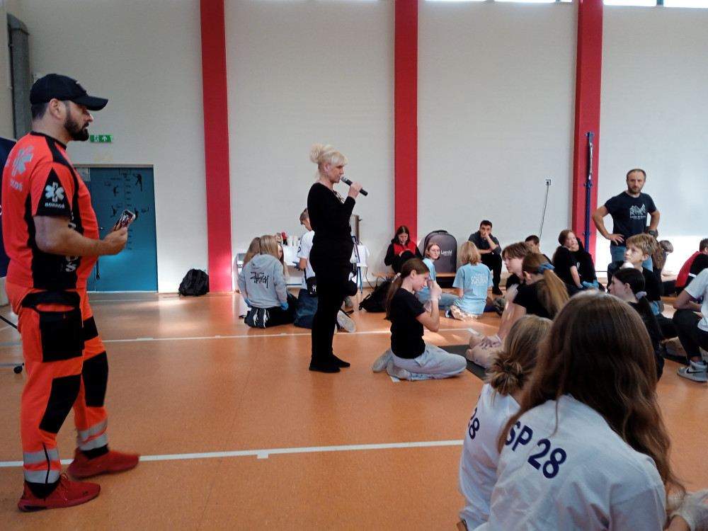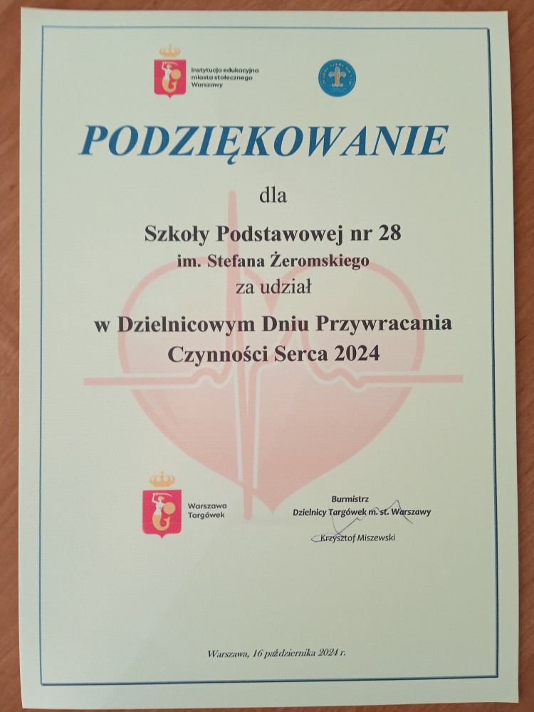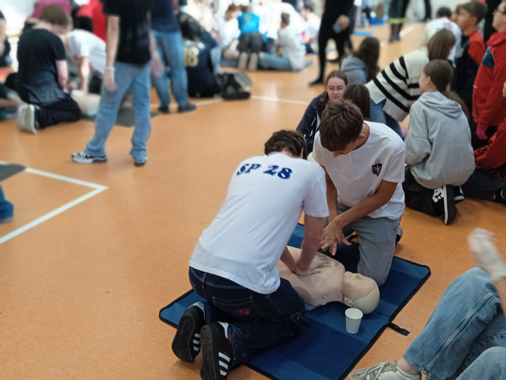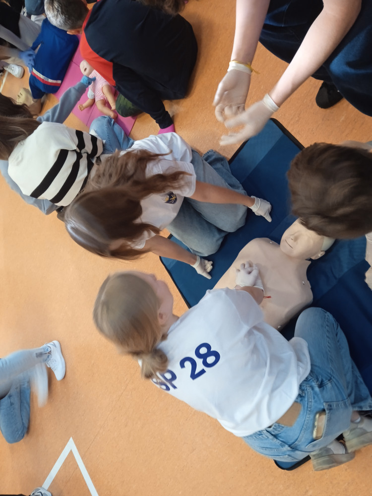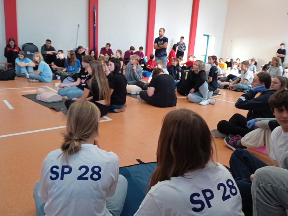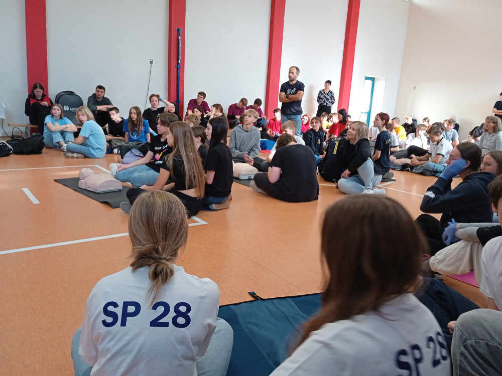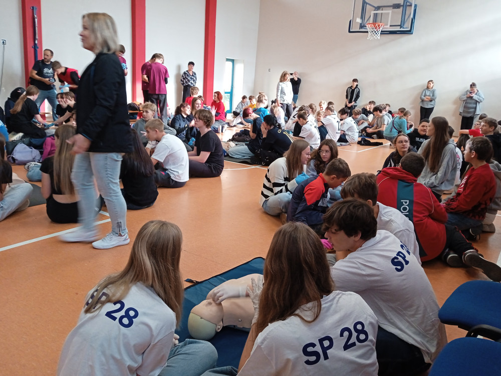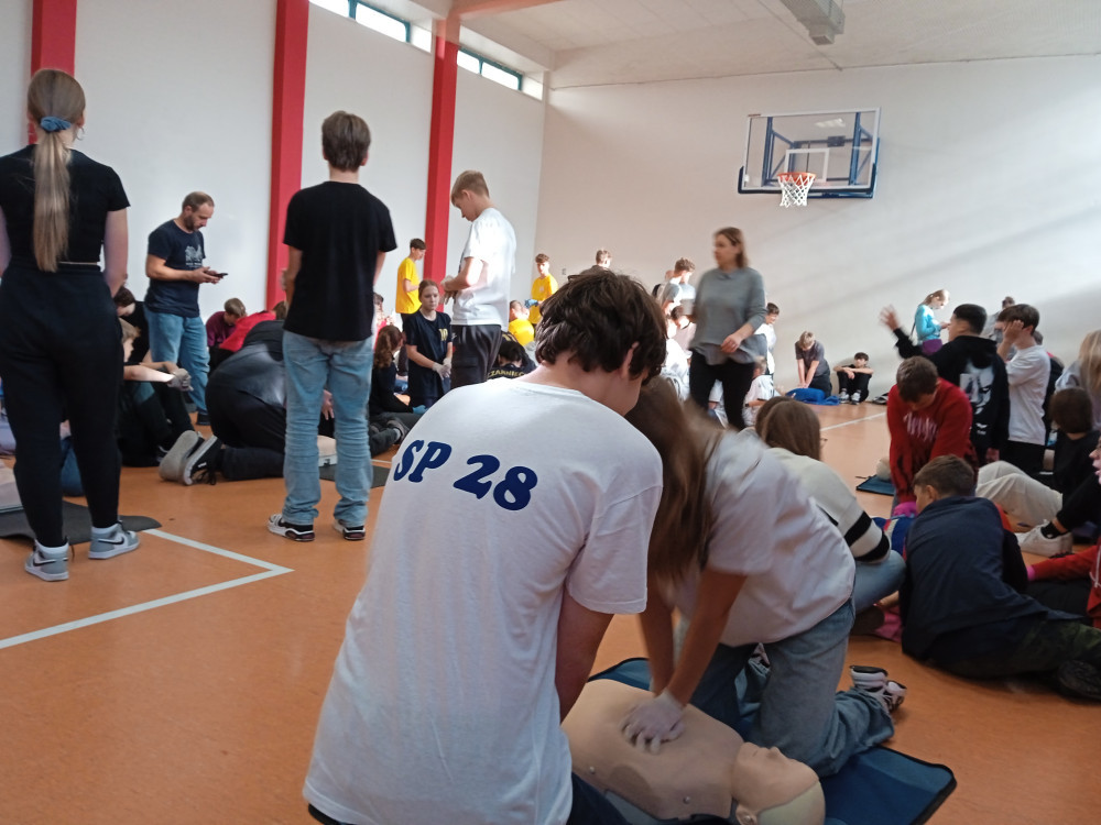 W dniu 16 października nasi wolontariusze z klasy 8 wraz z opiekunem P. Justyną Kamińską wzięli udział w akcji zorganizowanej przez Zespół Szkół nr 128 w Warszawie z okazji dzielnicowych obchodów Światowego Dnia Przywracania Czynności Serca. Uczniowie naprzemiennie przed 30 minut wykonywali uciśnięcia klatki piersiowej na fantomie.