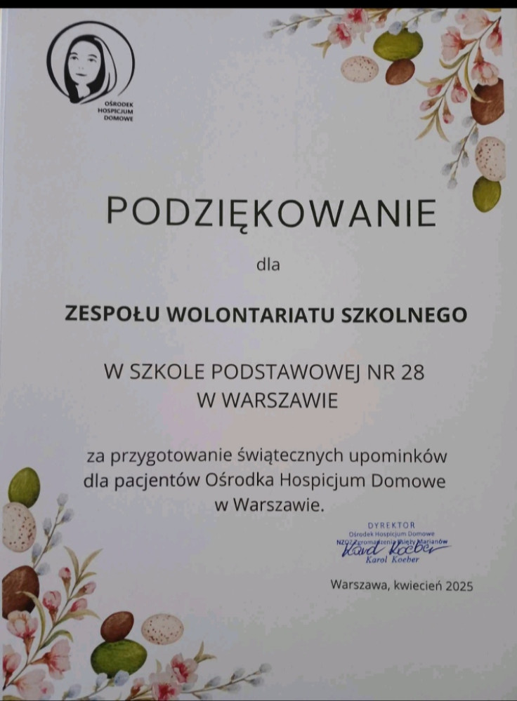 W marcu - we współpracy z Samorządem Uczniowskim oraz Świetlicą Szkolną „Zapiecek” – zorganizowaliśmy zbiórkę własnoręcznie przygotowanych stroików i kartek świątecznych dla pacjentów Hospicjum Domowego na Targówku.