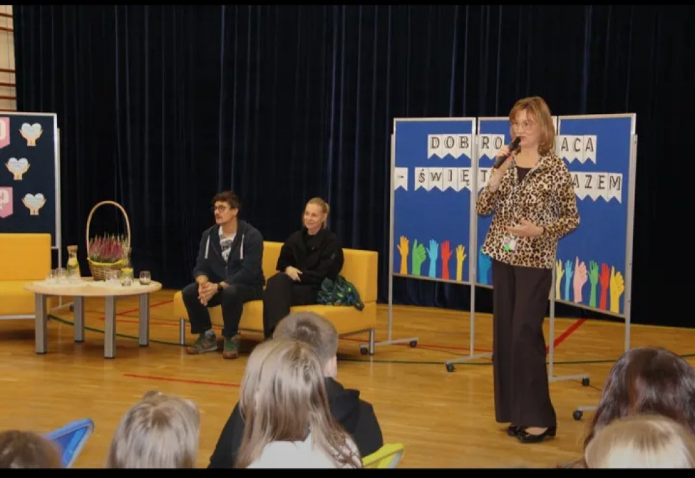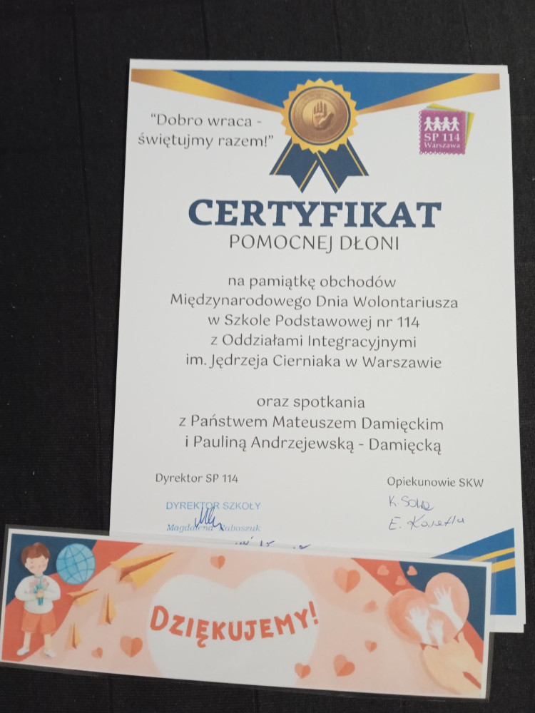 4 listopada 2025 r.- na zaproszenie Szkoły Podstawowej nr 114 z Oddziałami Integracyjnymi im. Jędrzeja Cierniaka w Warszawie, ul Remiszewska 40 – koordynator wolontariatu szkolnego oraz 5 wolontariuszek z kl. 7b wzięło udział w spotkaniu z okazji obchodów Międzynarodowego Dnia Wolontariusza pod hasłem „Dobro wraca – świętujmy razem!”